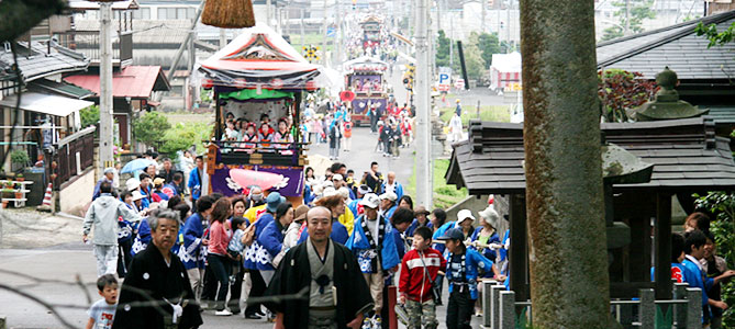 3基の神輿が巡行し、太刀振・お田植・神楽など 多彩な芸能が奉納されます。