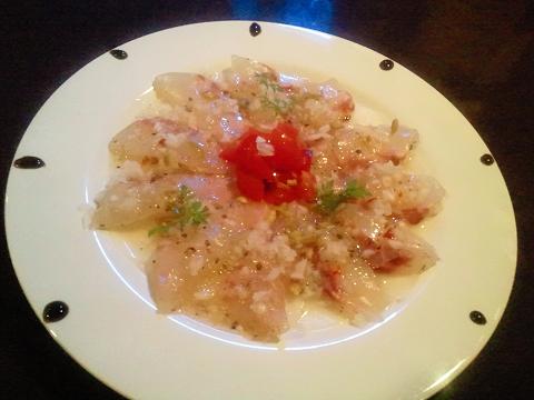 外食は勉強! 投稿日:2013年5月14日 作成者: tokioka 写真は、おおい町成和 「ルージュ」 にて食した 鯛のカルパッチョ! ここのマスター なかなか料理がうまくて、こんなきれいなのを 出してくれました。 味も VERY GOOD! 支配人 オネエチャンと お話しするよりも、マスターの料理が目的で 時々 訪問しております。 カウンターで 女性が前に来ると、困惑しながら 相槌(あいづち)だけの対応 ・・・ 違うか … (^_^.)