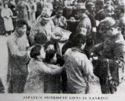 南京市民に食糧等を配る日本兵たち。